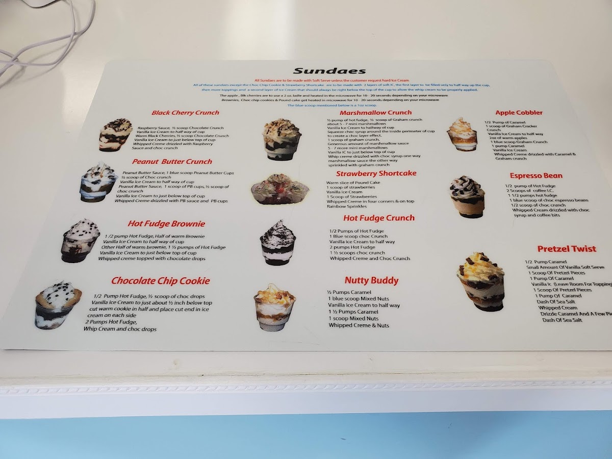 Made out of any flavor icecream: Black Cherry Vanilla, Black Rasberry, Butter Pecan, Chocolate, Coffee, Cookie Dough, Cookies n Cream, Cotton Candy, Cookie Monster, Cake Batter, Mint Chip, Mississippi Mud, Pistachio, Strawberry, Vanilla, Vanilla Graham.